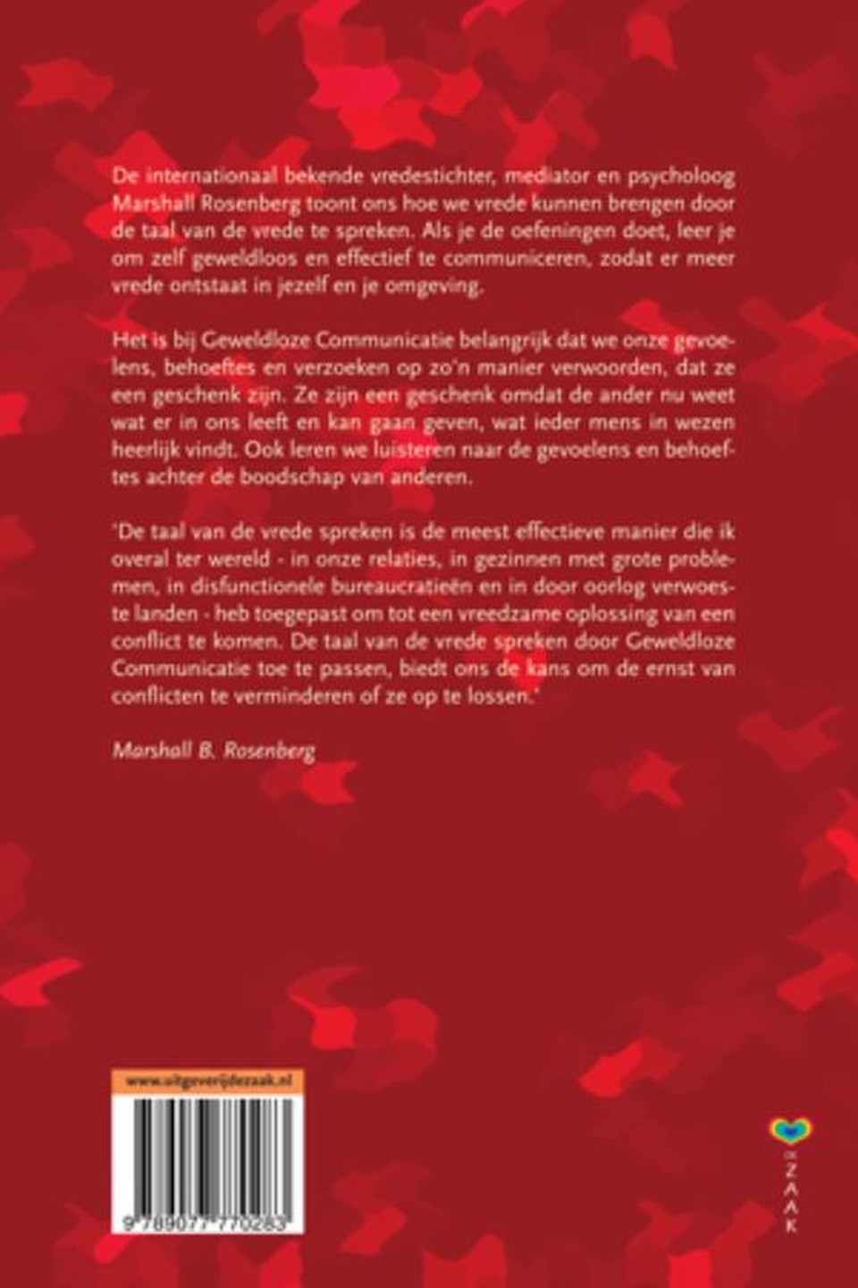Het is bij Geweldloze Communicatie belangrijk dat we onze gevoelens, behoeftes en verzoeken op zo'n manier verwoorden, dat ze een geschenk zijn. Ze zijn een geschenk omdat de ander nu weet wat er in ons leeft en kan gaan geven, wat ieder mens in wezen heerlijk vindt. We leren luisteren naar de gevoelens en behoeftes achter de uitspraken van andere mensen. 'De taal van de vrede spreken is de meest effectieve manier die ik overal ter wereld – in onze relaties, in gezinnen met grote problemen, in disfunctionele bureaucratieën en in door oorlog verwoeste landen – heb toegepast om tot een vreedzame oplossing van een conflict te komen. De taal van de vrede spreken door het model van Geweldloze Communicatie toe te passen, biedt ons de kans om de ernst van conflicten te verminderen of ze op te lossen.' - Marshall B. Rosenberg
