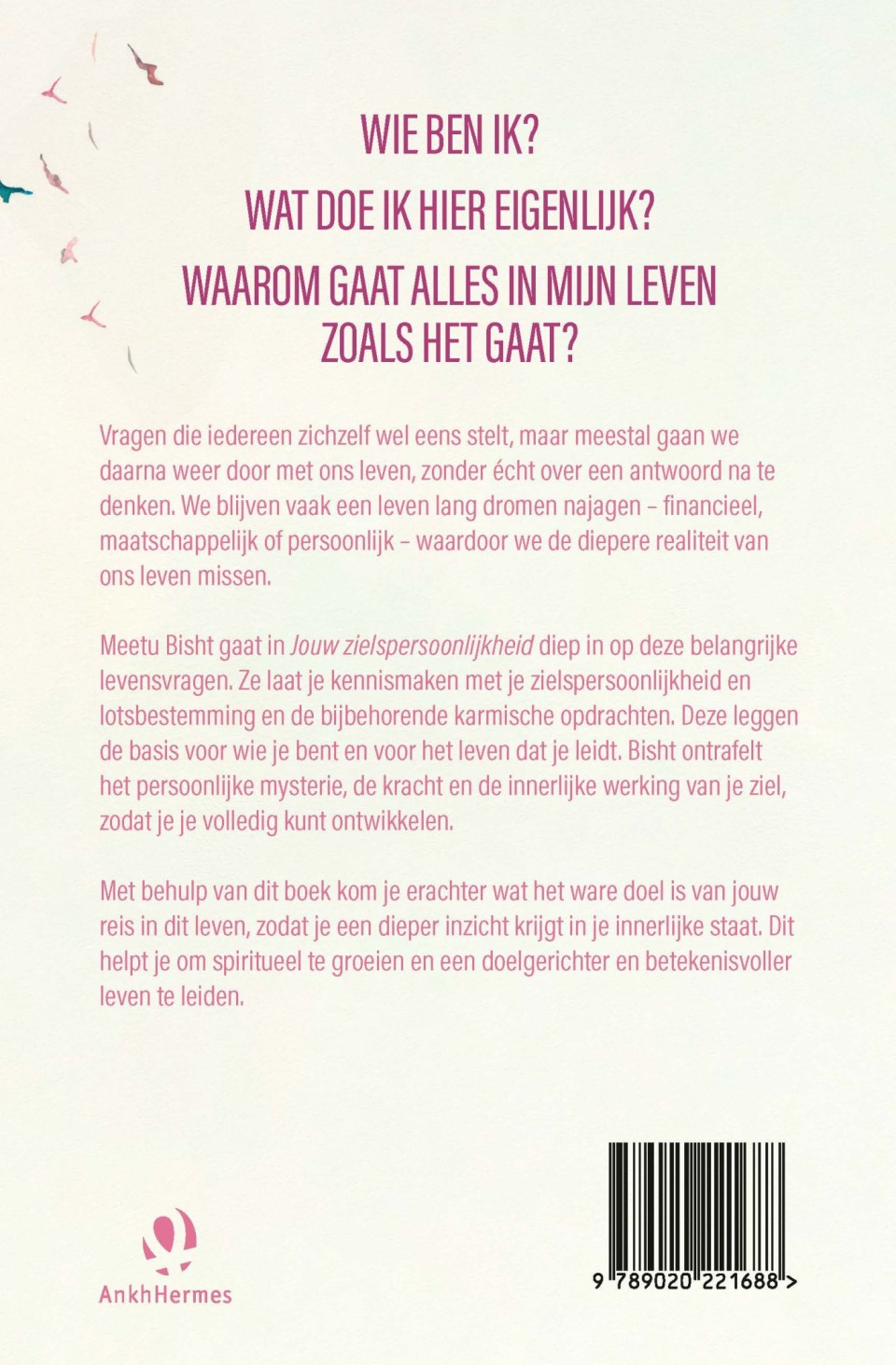 Meetu Bisht gaat in Jouw zielspersoonlijkheid diep in op deze belangrijke levensvragen. Je maakt kennis met je zielspersoonlijkheid en lotsbestemming en de bijbehorende karmische opdrachten. Deze leggen de basis voor wie je bent en voor het leven dat je leidt. Bisht ontrafelt het persoonlijke mysterie, de kracht en de innerlijke werking van een ziel, zodat je je als ziel kunt ontwikkelen.
