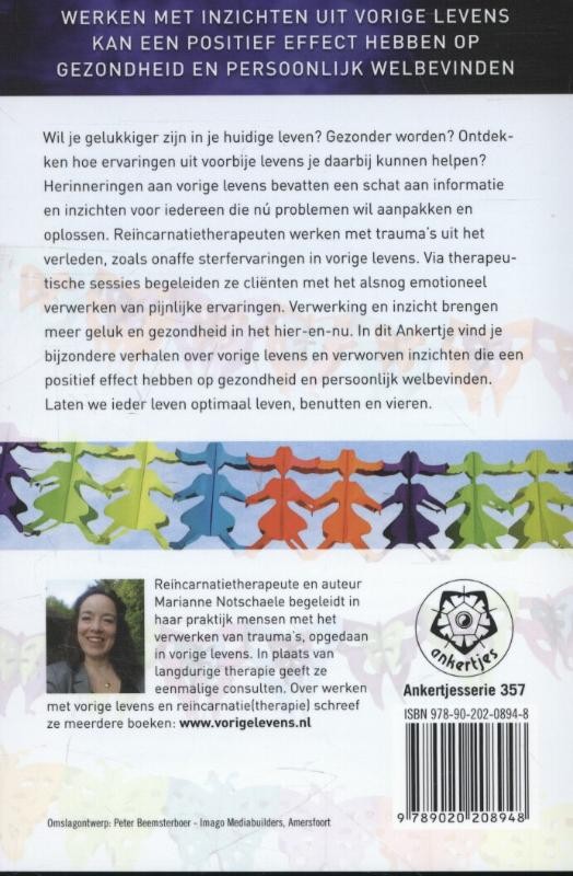Reïncarnatietherapeuten werken met trauma's uit het verleden, zoals onaffe sterfervaringen in vorige levens. Via therapeutische sessies begeleiden ze cliënten met het alsnog emotioneel verwerken van pijnlijke ervaringen. Verwerking en inzicht brengen meer geluk en gezondheid in het hier en nu. In dit Ankertje vind je bijzondere verhalen over vorige levens en verworven inzichten die een positief effect hebben op gezondheid en persoonlijk welbevinden. Laten we ieder leven optimaal leven, benutten en vieren.