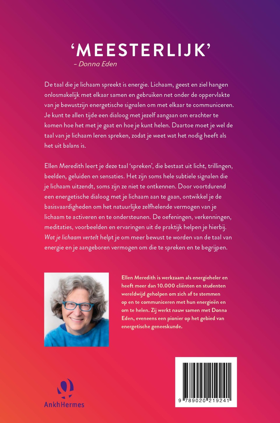 Ellen Meredith leert je deze taal ‘spreken’, die bestaat uit licht, trillingen, beelden, geluiden en sensaties. Het zijn soms hele subtiele signalen die je lichaam uitzendt. Door voortdurend een ‘energetische dialoog’ met je lichaam aan te gaan, ontwikkel je de basisvaardigheden om het natuurlijke zelfhelende vermogen van je lichaam te activeren en te ondersteunen. De oefeningen, verkenningen, meditaties, voorbeelden en ervaringen uit de praktijk helpen je hierbij. Wat je lichaam vertelt helpt je om meer bewust te worden van de taal van energie en je aangeboren vermogen om die te spreken en te begrijpen.