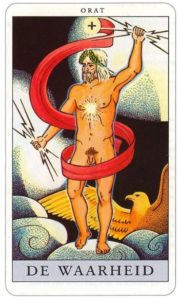 Grote Arcana Waarheid toont een naakte man in de wolken met bliksemschichten in zijn handen. Om de man heen golft een weinig verhullend, rood lint. Aan zijn voeten is een adelaar zichtbaar. In de eerste wereld zien we de verbeelding van oppergod Zeus of Jupiter.