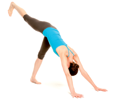 Ga op handen en knieën zitten en spreid je vingers. Prik je tenen in de grond, duw je heupen omhoog en duw jezelf naar achteren in de neerwaartse hond. Druk je hielen tegen (of in de richting van) de grond en ontspan je schouders, nek en hoofd. Blijf vijf lange, diepe ademhalingen in deze houding. Adem in en til je rechterbeen op. Houd je heupen recht en flex je voet zodat je tenen naar beneden wijzen. Til je been vanuit de achterkant van je bovenbeen nog iets verder op. Duw beide handen en voeten evenveel van je af. Blijf drie lange, diepe ademhalingen in deze houding.